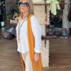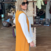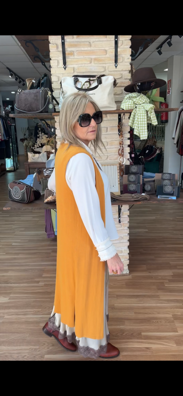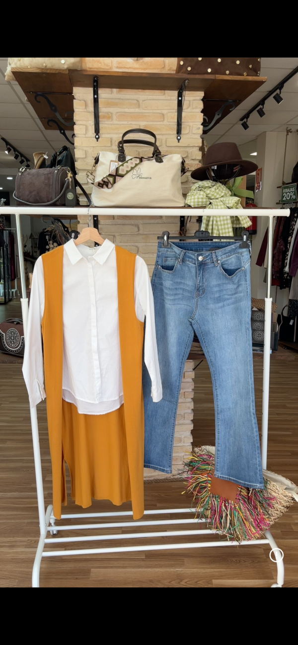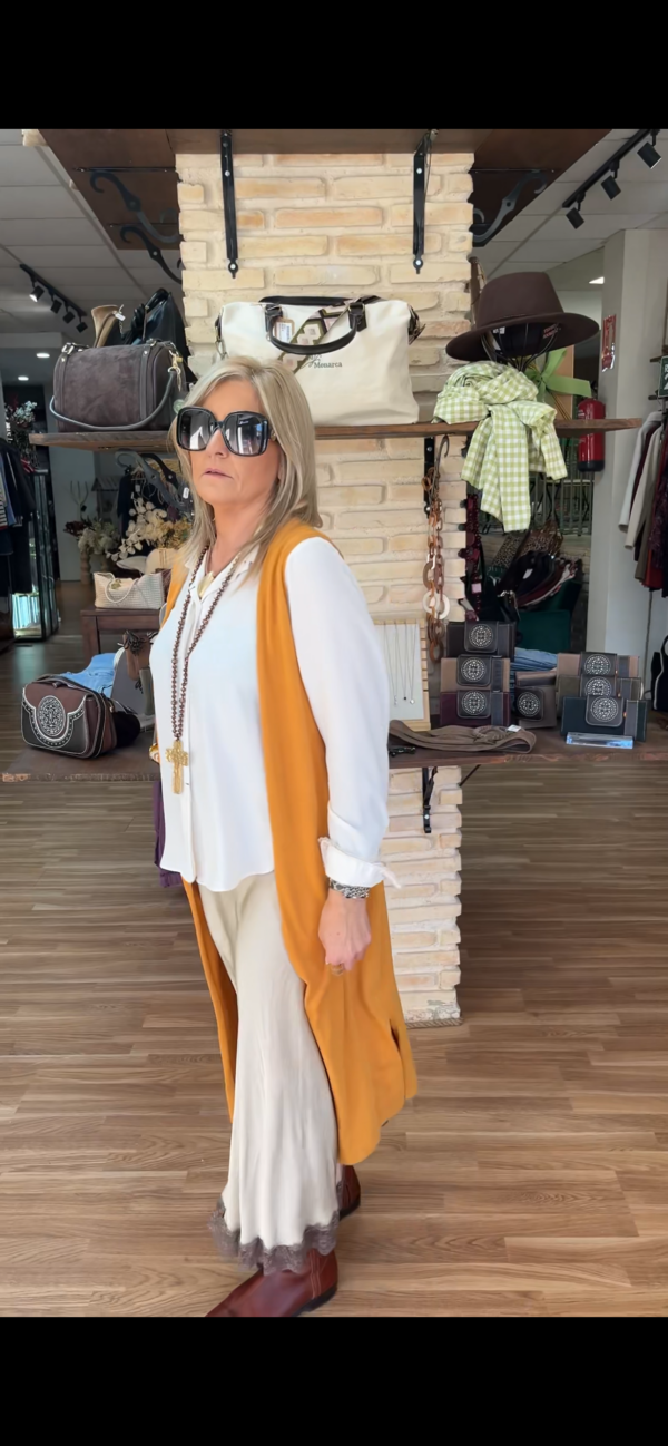 Chaleco largo de caída fluida que aporta estilo y movimiento al look. Perfecto para combinar con vestidos, pantalones o conjuntos relajados. Una prenda versátil ideal para entretiempo.