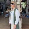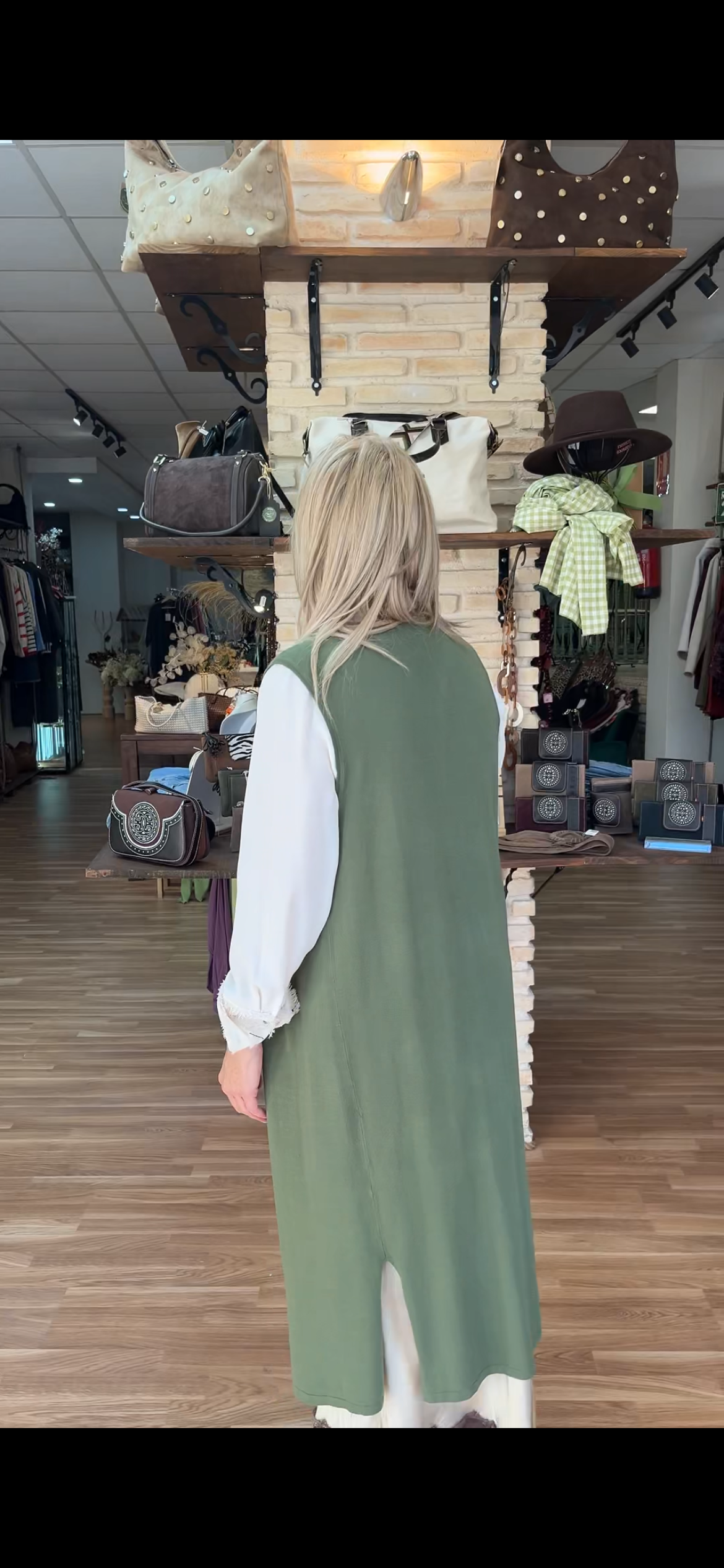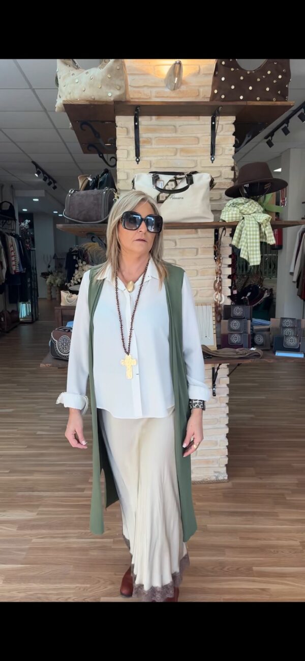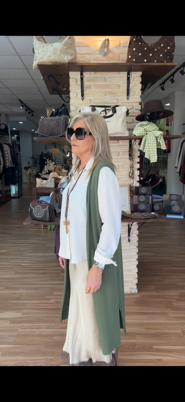 Chaleco largo de caída fluida que aporta estilo y movimiento al look. Perfecto para combinar con vestidos, pantalones o conjuntos relajados. Una prenda versátil ideal para entretiempo.